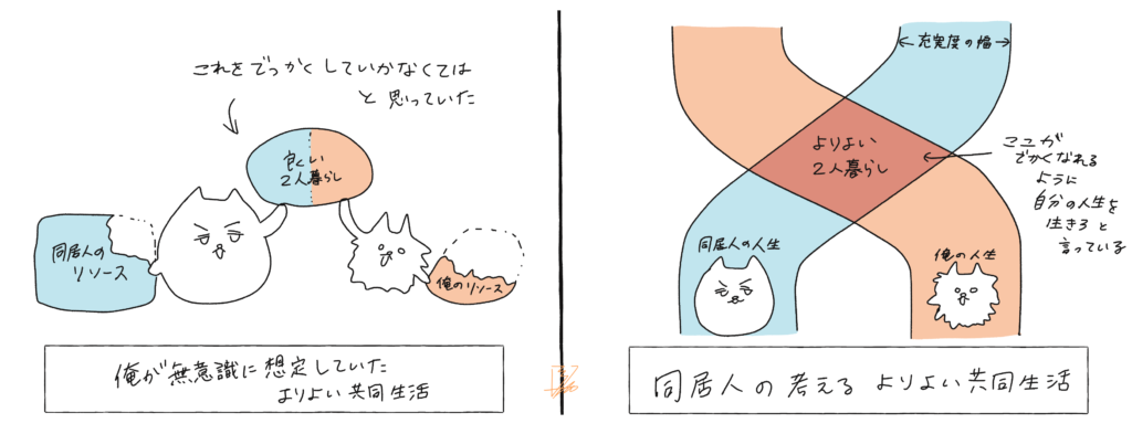俺は最初何を言われているか分からなかったが、話を聞いているうちに段々とその指摘を理解していった。俺は他者との共同生活をより良いものにする為には、より良いものにしようと意識し努め続けることが最も肝要と考えていた。しかしそれは円滑で快適な共同生活を“続ける”為の努力であり、その事に対して常にリソースを最優先で割こうと考え過ぎている.という指摘だった。そして、「リソースを分け与えた分だけより良い共同生活になっていく」という考え方ではなく、「2つの人生の交点が共同生活であり、2つの人生の充実の幅が広いほど共同生活の充実も大きくなる」と考えているという話だった。(図1)。