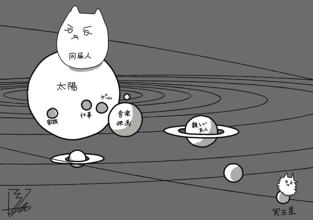 彼は彼の宇宙の中心にいて、その周りで好きなものや好きなこと、彼に関わることが公転している。彼が太陽系の太陽だとしたら、一番近い水星や金星が彼が真剣に取り組んでいるFPSゲームや仕事、地球や火星は家族や好きな音楽…と順に彼の人生の優先順に好きなものの惑星が周っていて、同居し始めたばかりの頃の俺はその公転に合わせて自分も周る必要があると思っていた。どの星よりも遠く、軌道にずれがあり近づいたり離れたりしながらそれでも他の小さな星々よりは惑星な気がしていた準惑星、冥王星だった。自分の自転もしながら遠くで248年もかけて一周しなきゃいけないことが俺は大変だなと思っていたし、あまり日が当たらないことを勝手に悲観し寂しさを感じ、勝手に消耗していたのだ。(図2)。