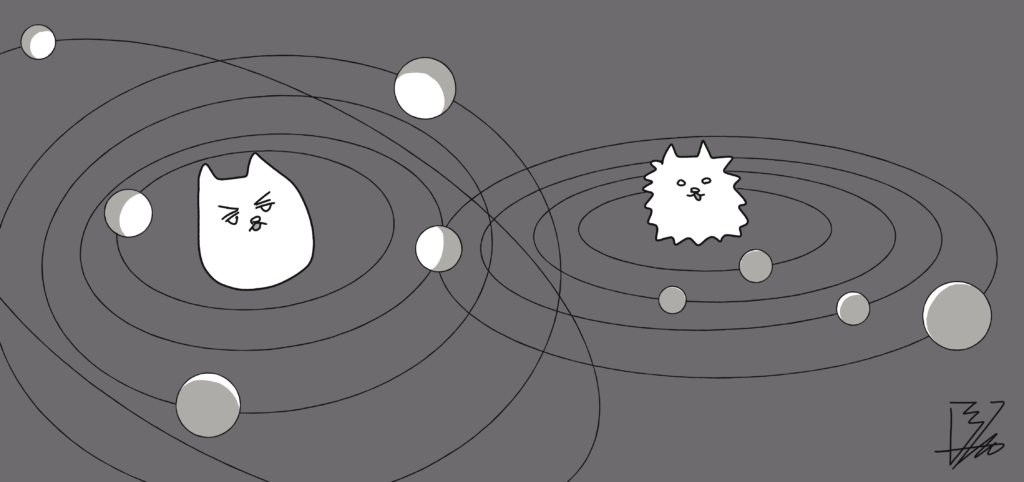 しかし次第にその考え方ではなくなっていった。彼に合わせて周るのではなくて、自分も自分自身の宇宙の中心である。という考え方に変わっていったのだ。(図3)。自分の惑星系を持って自分がその中心になると、俺の近くには最愛の妹についてだったり、美味しいグルメやスイーツ、高校で夢中で打ち込んだ弓道や芸術などの専攻の惑星が回っていて、好きな漫画や映画も近くで周っている。そして隣を見たらすぐ近くで同居人の惑星系が観測できるのだ。